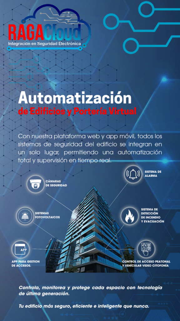 - Con RAGACloud, lleva tu seguridad y eficiencia al siguiente nivel con portería virtual, reconocimiento facial, lectura automática de placas y videovigilancia en la nube. Control total, acceso automatizado y monitoreo remoto 24/7 — todo desde una sola plataforma. Ahorra costos, mejora la seguridad y disfruta de un entorno moderno y conectado. RAGACloud: Tecnología que protege, automatiza y conecta.